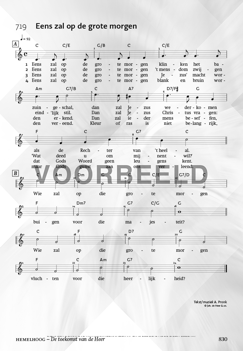 | Aanhef (eerste regel) | Eens zal op de grote morgen |