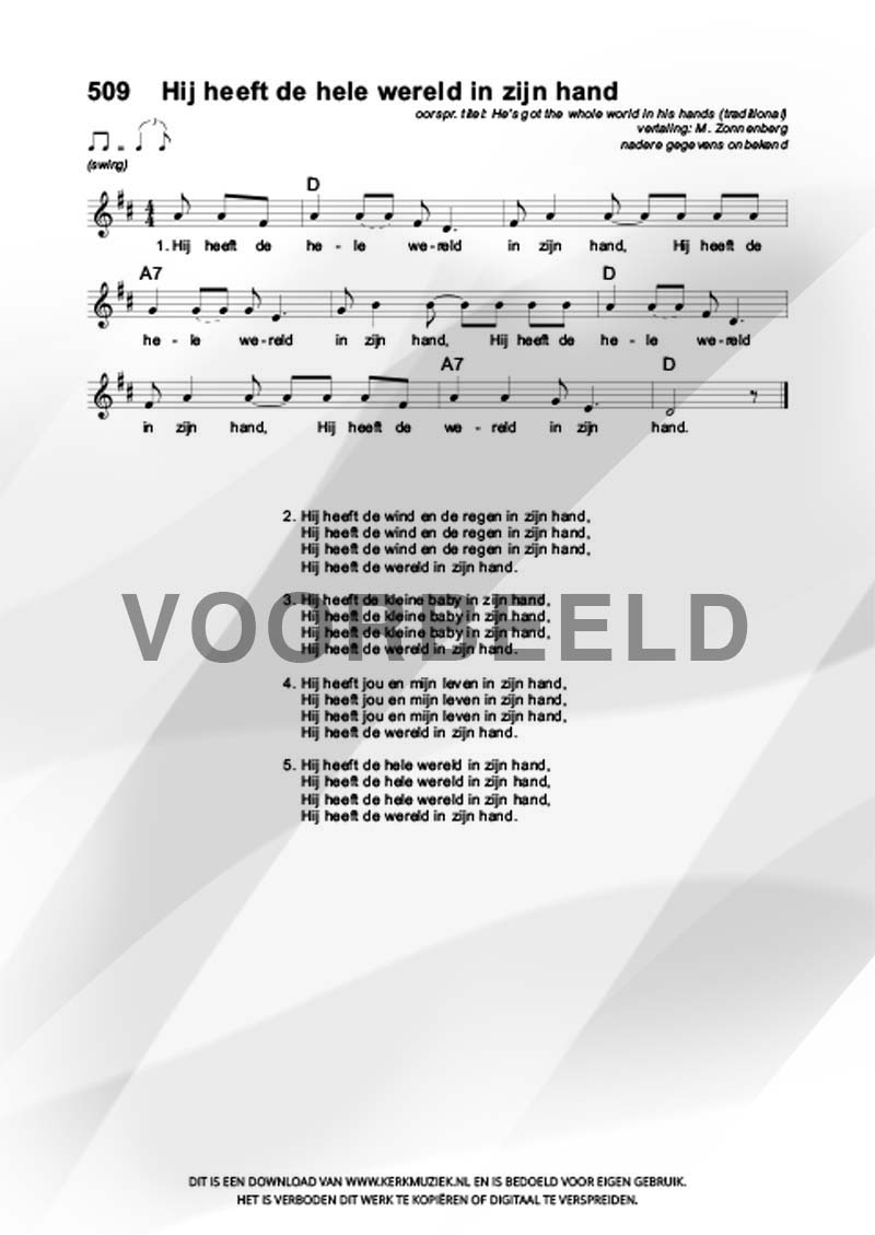 | Aanhef (eerste regel) | Hij heeft de hele wereld in zijn hand |