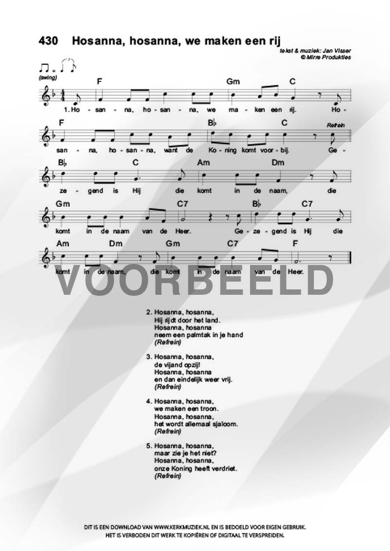 | Aanhef (eerste regel) | Hosanna, hosanna, we maken een rij |