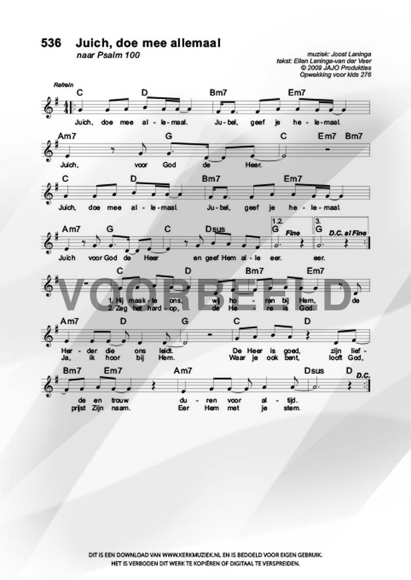 LET OP: U dient ZELF de liedbestanden te downloaden en af te drukken. Wij sturen u dus géén bladmuziek per post toe! U kunt na een geslaagde betaling direct zelf aan de slag.