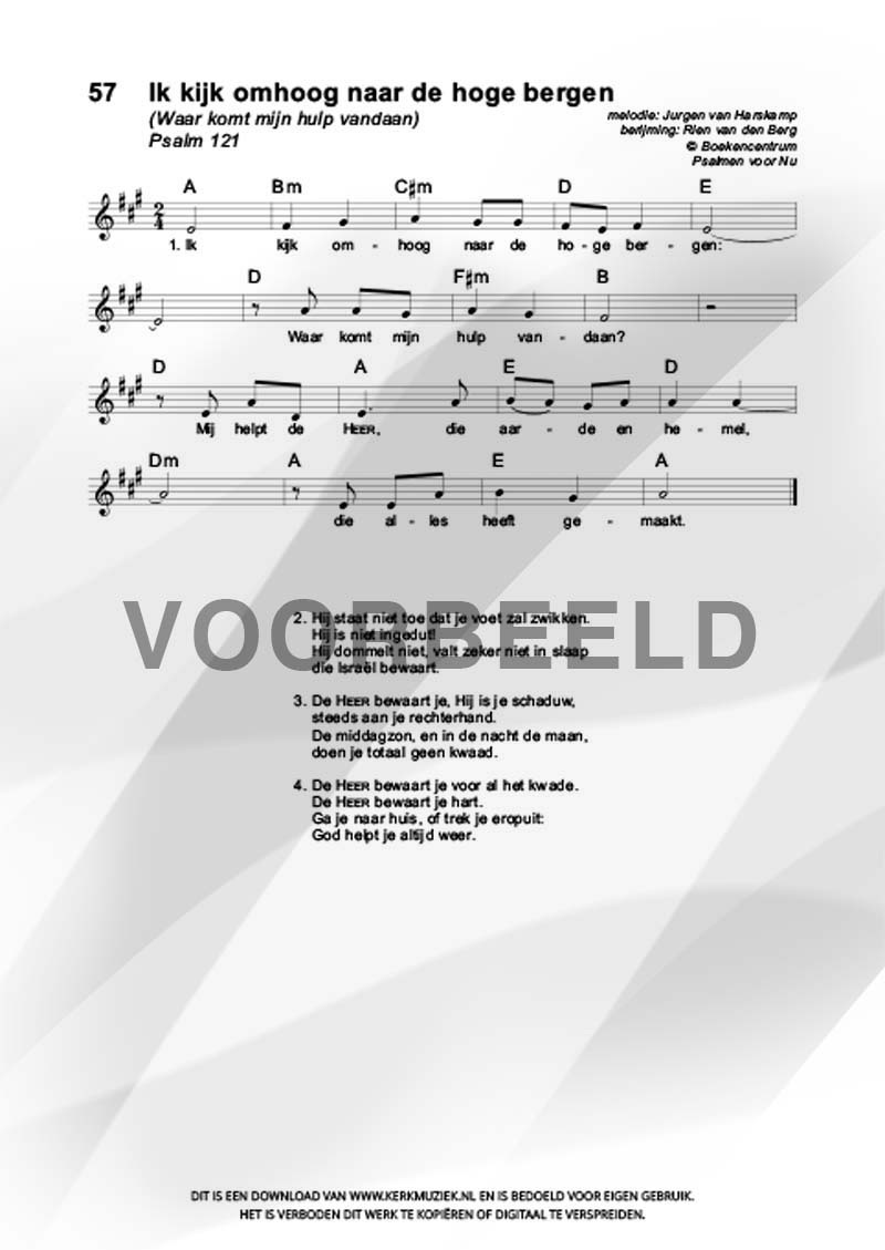 | Aanhef (eerste regel) | Ik kijk omhoog naar de hoge bergen |