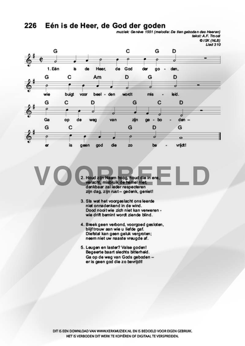 | Aanhef (eerste regel) | Eén is de Heer, de God der goden |