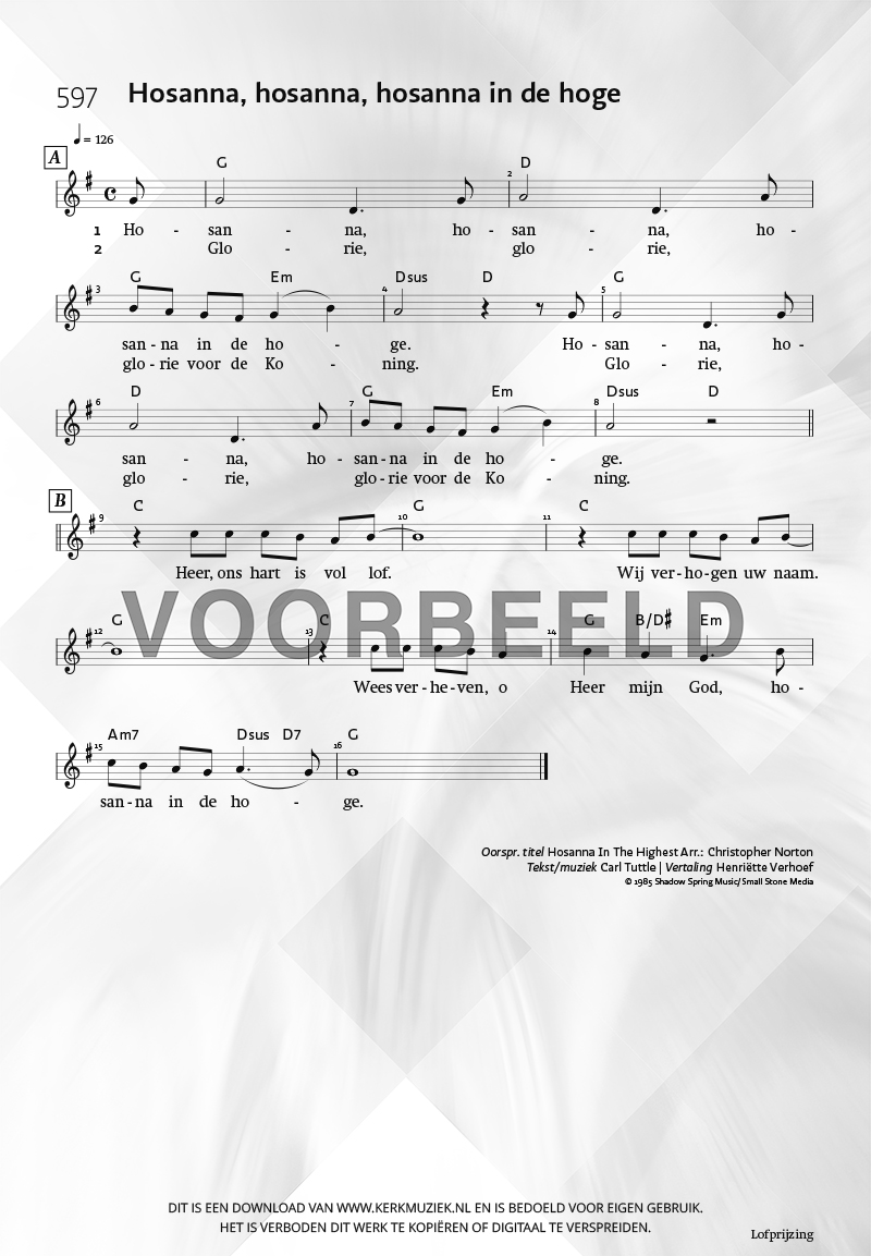 | Aanhef (eerste regel) | Hosanna, hosanna, hosanna in de hoge |