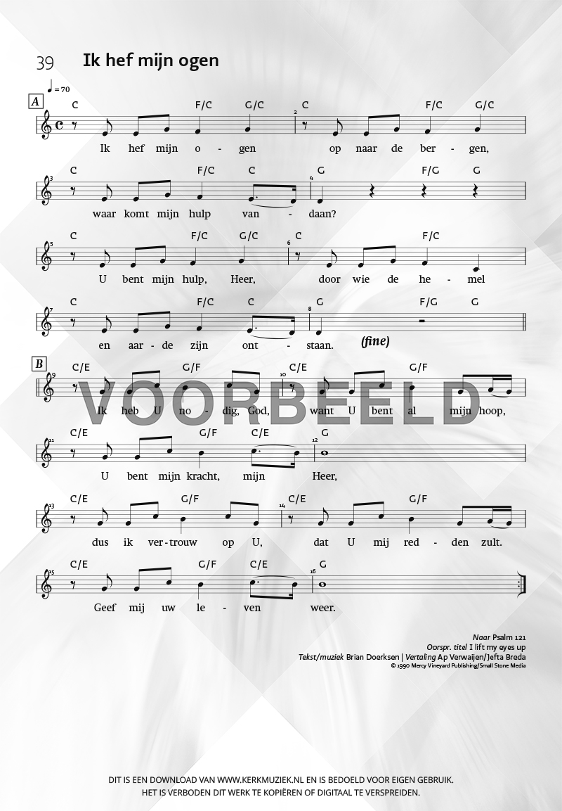 | Aanhef (eerste regel) | Ik hef mijn ogen op naar de bergen |