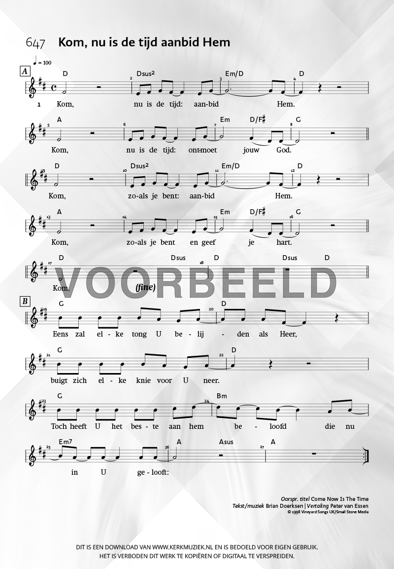 | Aanhef (eerste regel) | Kom, nu is de tijd aanbid Hem |