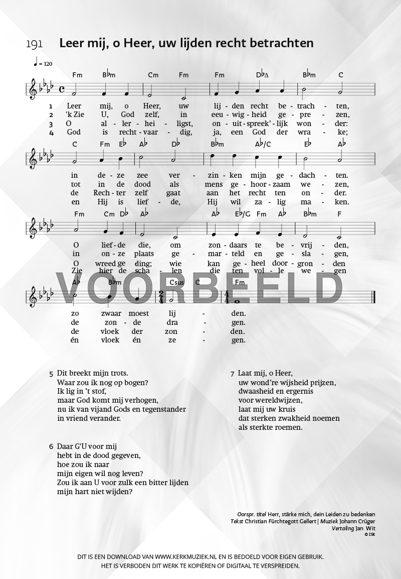 | Aanhef (eerste regel) | Leer mij, o Heer, uw lijden recht betrachten |