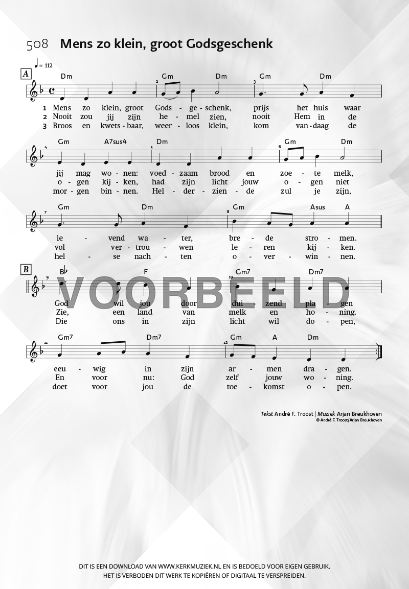 | Aanhef (eerste regel) | Mens zo klein, groot Godsgeschenk |