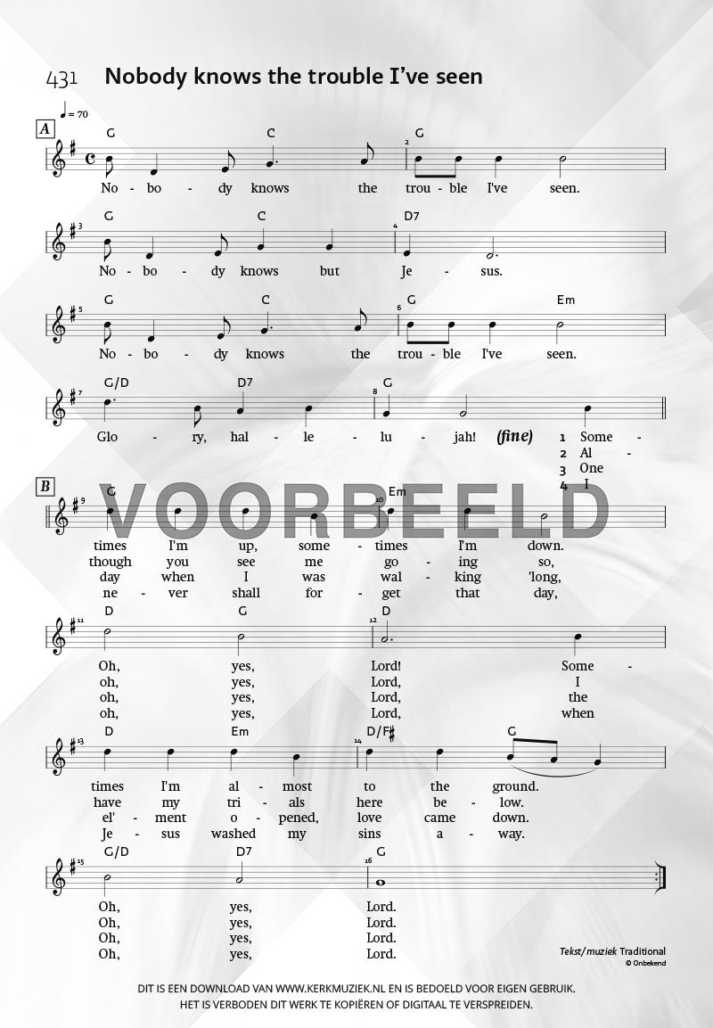 | Aanhef (eerste regel) | Nobody knows the trouble I’ve seen |