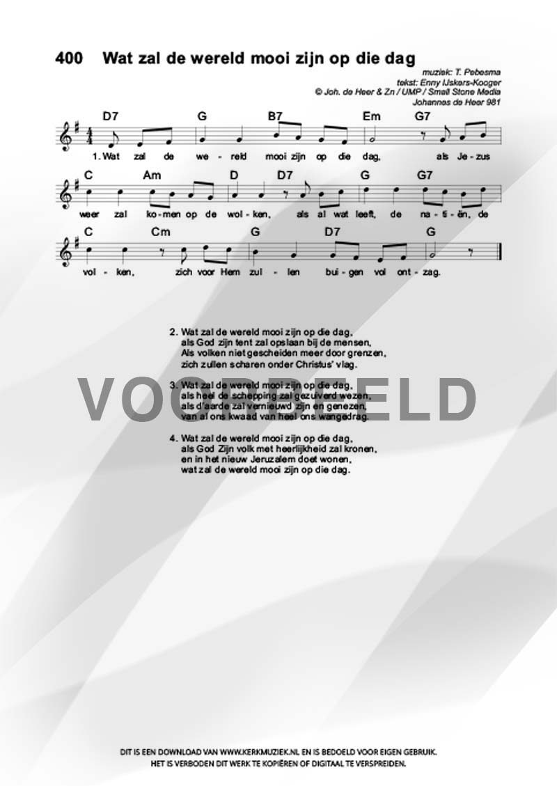 | Aanhef (eerste regel) | Wat zal de wereld mooi zijn op die dag |