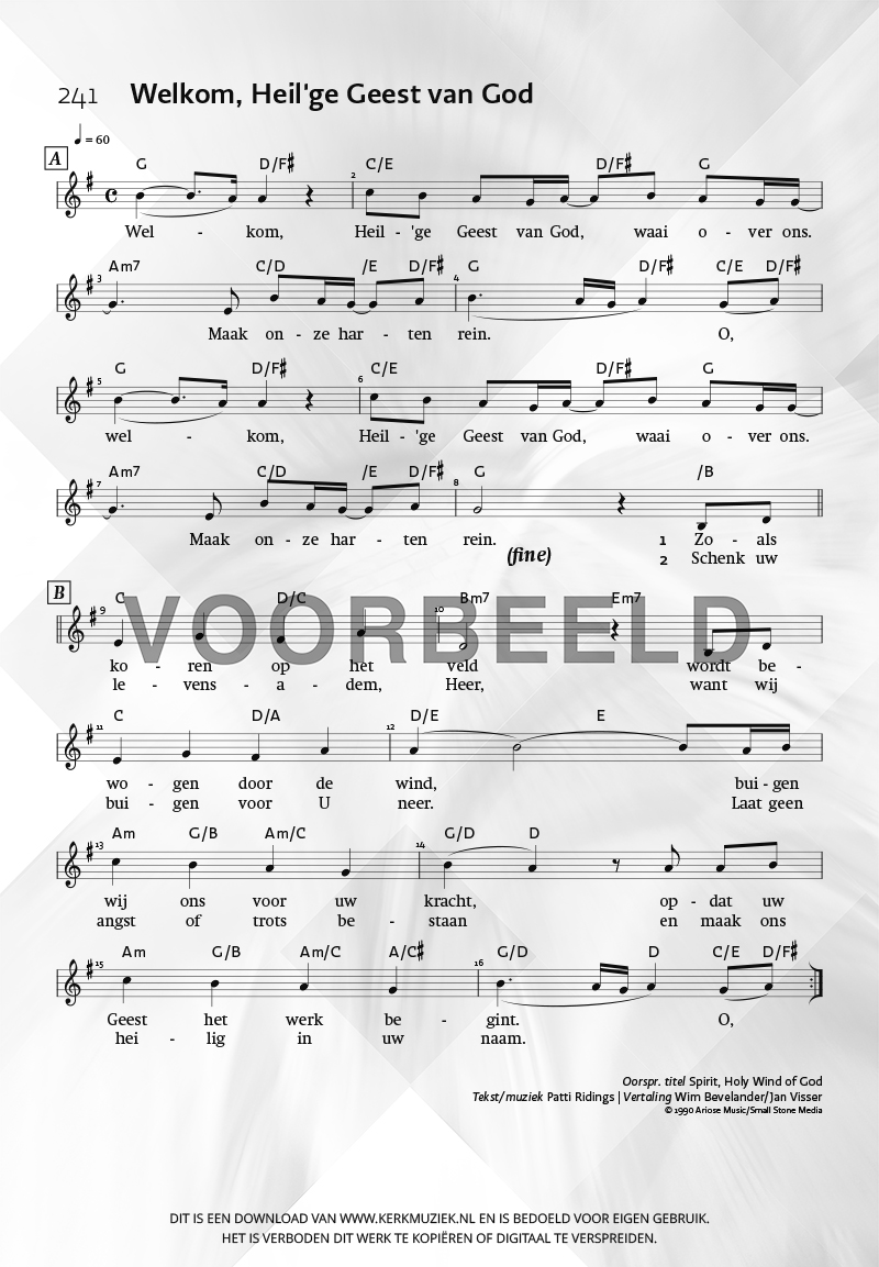 | Aanhef (eerste regel) | Welkom, heil’ge Geest van God |