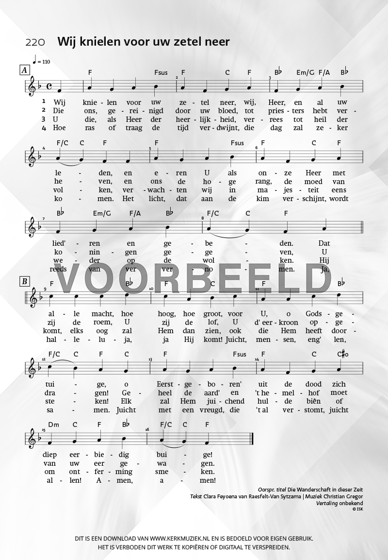 | Aanhef (eerste regel) | Wij knielen voor uw zetel neer |