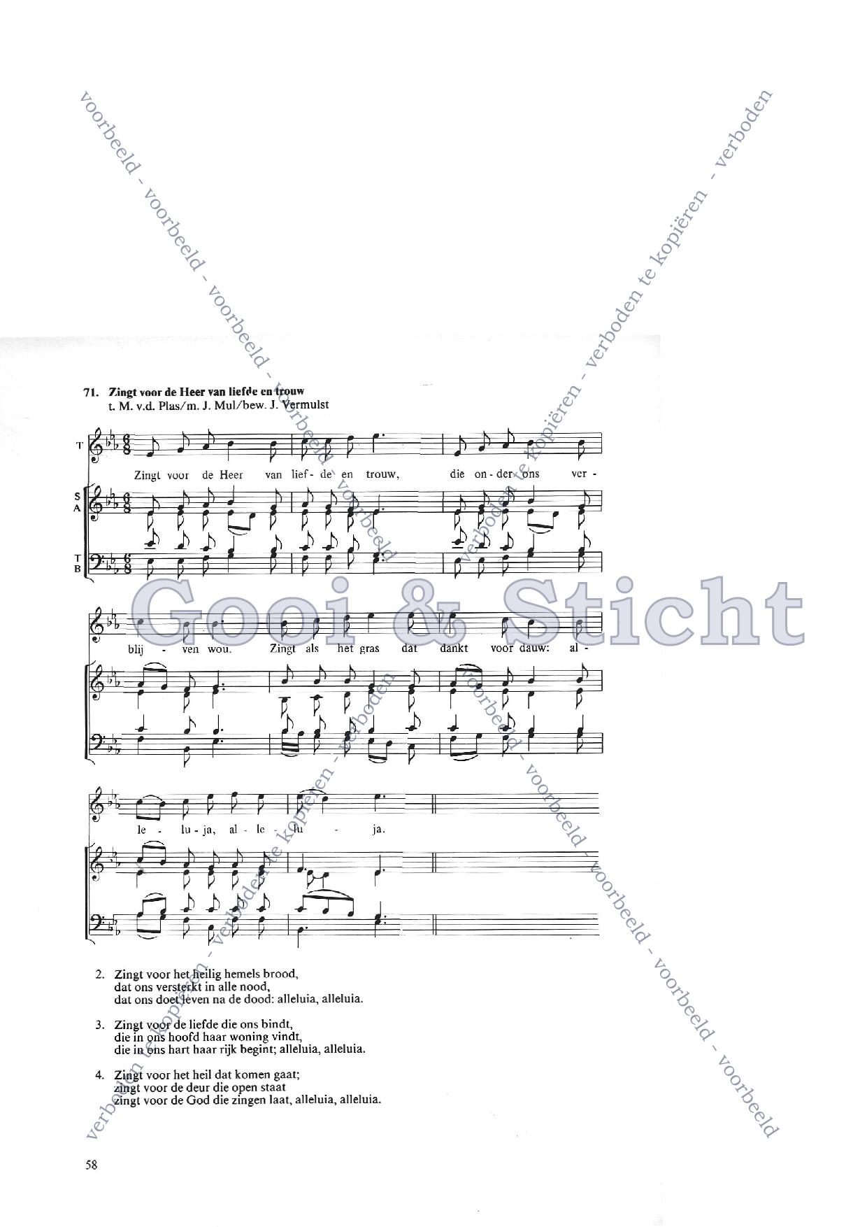 | Aanhef (eerste regel) | Zingt voor de heer van liefde en trouw |